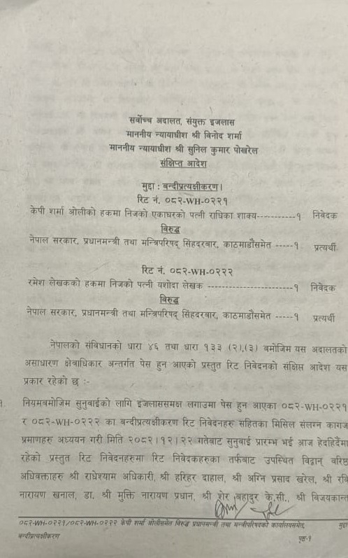 सर्वोच्च अदालतका न्यायाधीशद्वय विनोद शर्मा र सुनिल कुमार पोखरेलको संयुक्त इजलासले बन्दी प्रत्यक्षीकरणको रिटमा सोमबार सुनुवाइ गर्दै रिट खारेज गरेको हो ।