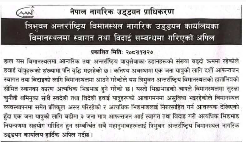 विमानस्थलमा धेरै भिड हुने गरेको भन्दै प्राधिकरणले सूचना निकालेर यस्तो आग्रह गरेको हो । प्राधिकरणका अनुसार अहिले आन्तरिक तथा अन्तर्राष्ट्रिय वायुसेवाका उडानहरूको संख्या बढ्दो क्रममा रहेकाले हवाई यात्रुहरूको संख्या पनि बढेको छ ।