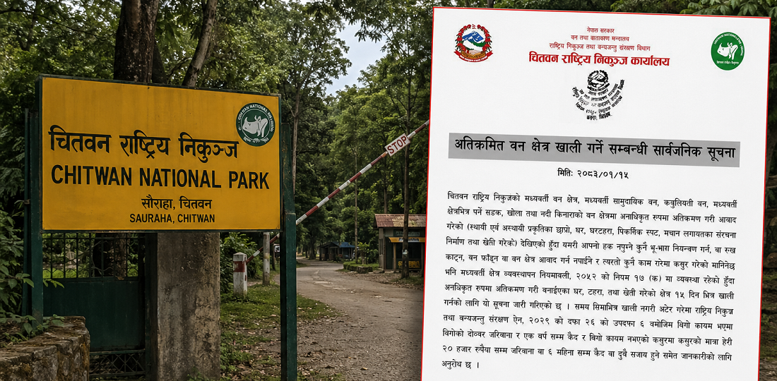 चितवन राष्ट्रिय निकुञ्ज कार्यालयले निकुञ्ज तथा मध्यवर्ती क्षेत्रभित्र भएका अतिक्रमण हटाउन सार्वजनिक सूचना जारी गरेको छ ।