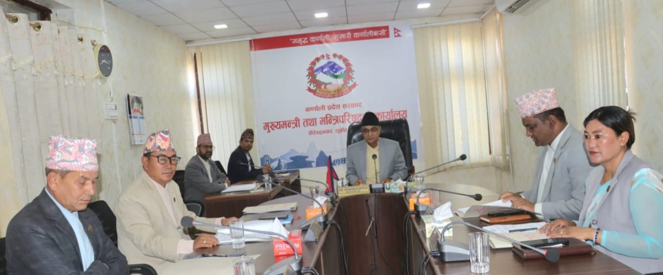 कर्णालीमा मङ्गलवार बिहान मन्त्रिपरिषद्को बैठक बसेको छ । उक्त बैठकमा कर्णाली प्रदेश सवारी तथा यातायात व्यवस्था नियमावली, २०८२ स्वीकृत गर्ने निर्णय भएको सरकारका प्रवक्ता विनोदकुमार शाहले बताए ।