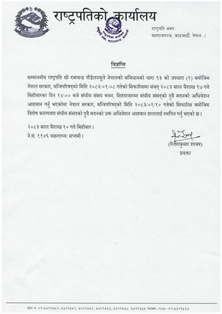 राष्ट्रपतिको कार्यालयका प्रवक्ता रितेशकुमार शाक्यद्वारा जारी विज्ञप्तिमा विशेष कारणवश मन्त्रिपरिषद्ले आजै पुन: सिफारिस गरेपछि पूर्वघोषित अधिवेशन आह्वान हाललाई स्थगित गरिएको उल्लेख छ। मन्त्रिपरिषद्को पछिल्लो निर्णयसँगै वैशाख १७ गते सुरु हुने भनिएको संसद्को बजेट अधिवेशन अन्योलमा परेको छ।